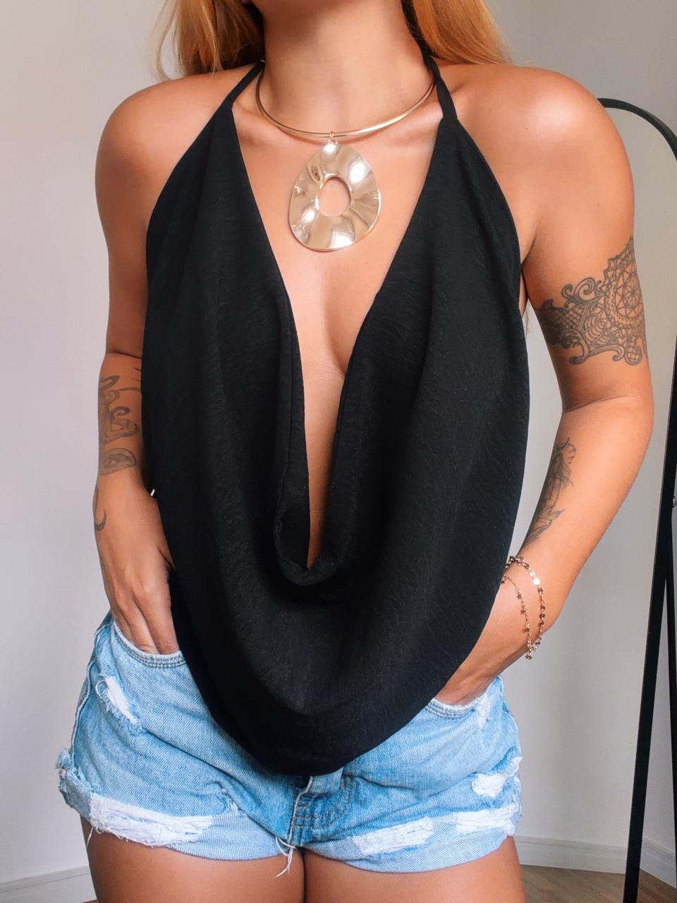 Bata soltinha no tecido duplo de viscose, tecido fresco e respirável, possui amarração no pescoço e costas (seus cordões de amarração são longos, possibilitando vestir diversos tamanhos de busto tranquilamente).