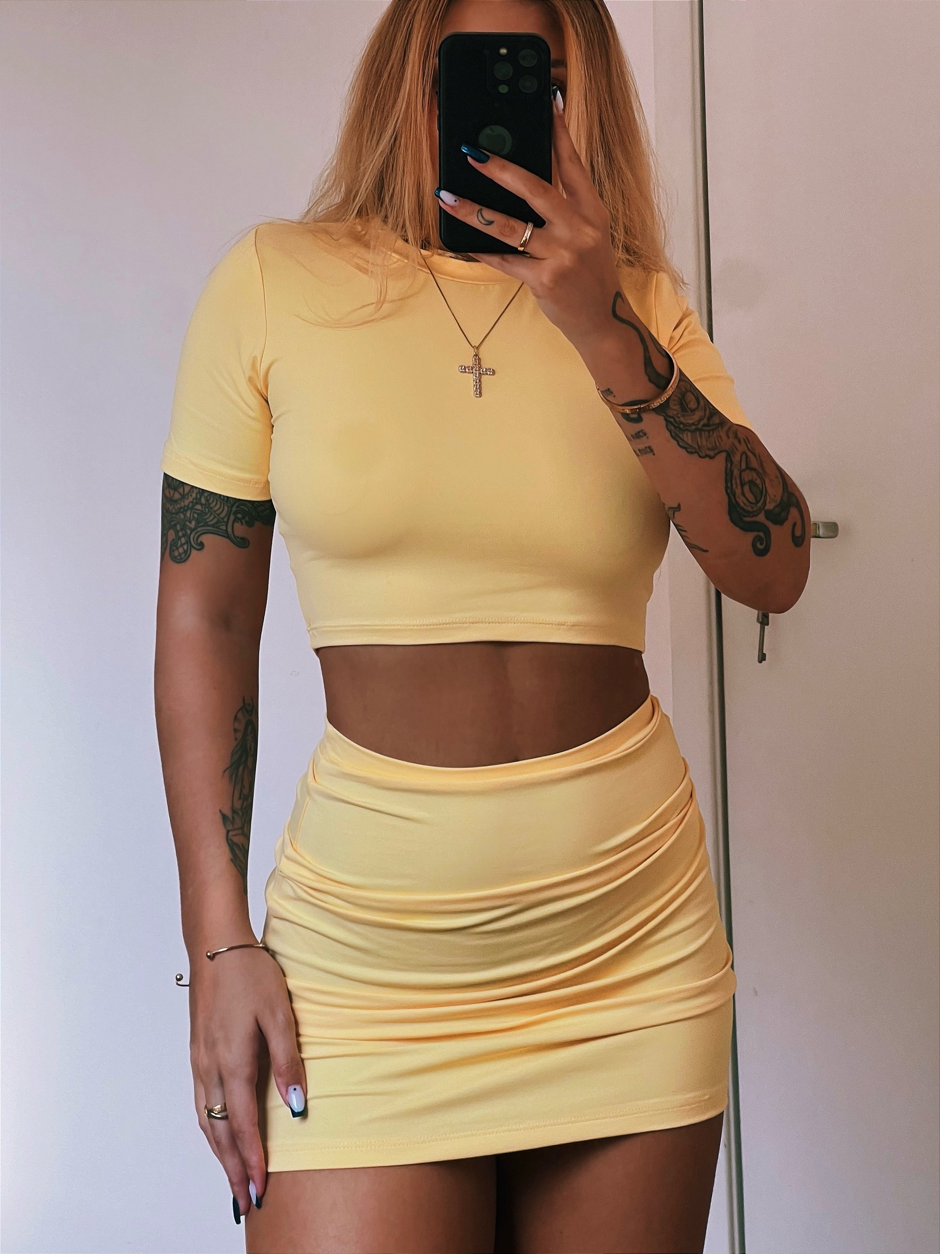 Conjunto em poliamida em tons pastéis composto por cropped modelagem camisetinha + saia básica.