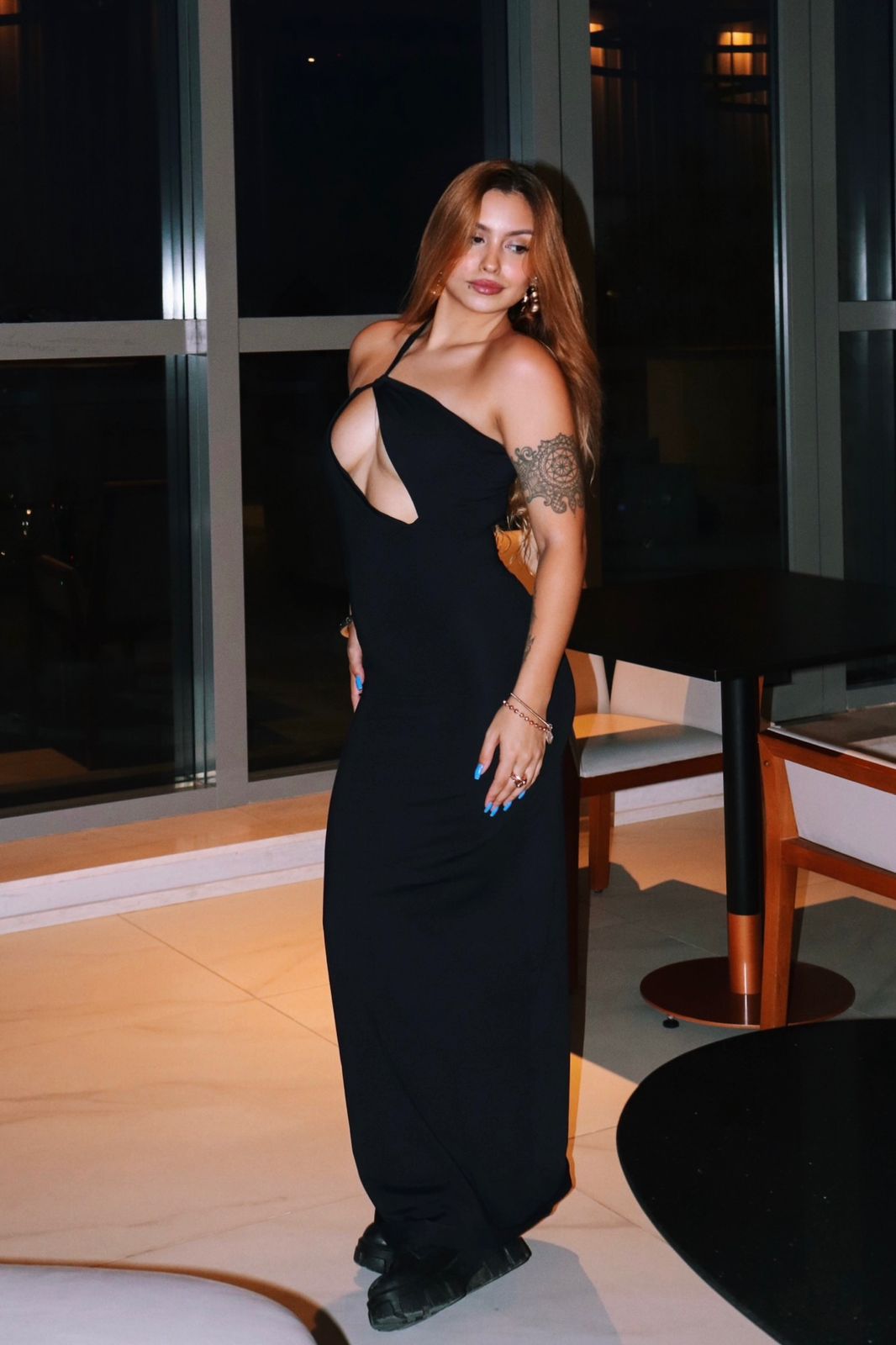 Vestido longo em poliamida com recorte oval no busto, camada dupla, sem bojo e ombro único.